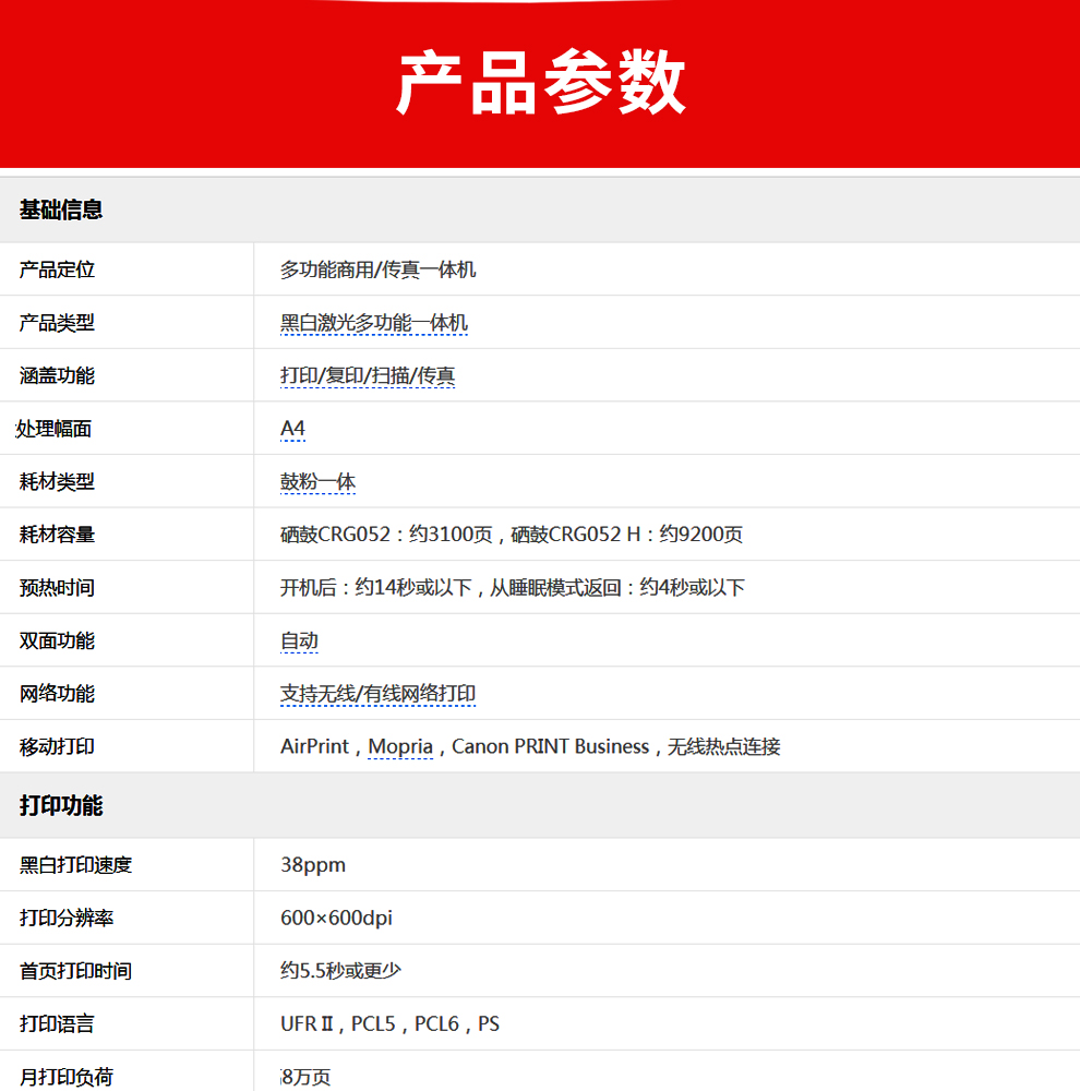 佳能(Canon)ic MF426dw A4幅面黑白激光多功能办公一体机 打印复印扫描传真