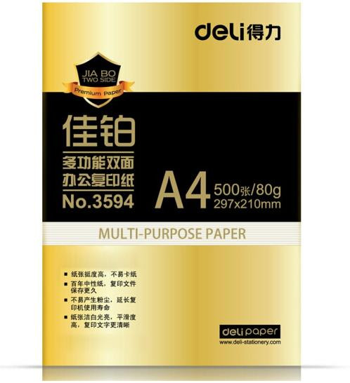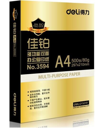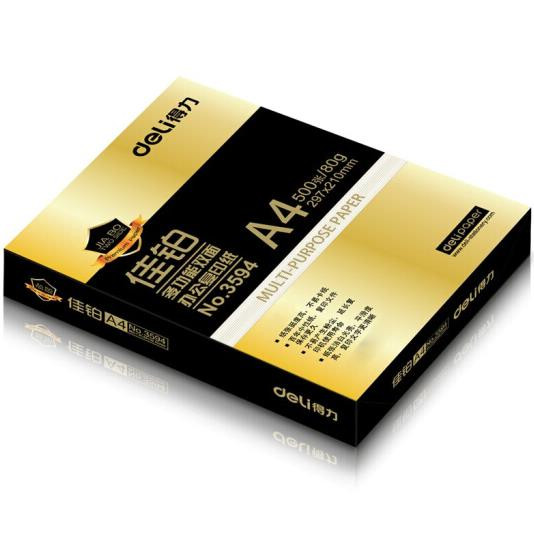 • 商品名称:得力(deli) 3595A4 佳铂复印纸 80g 500张/包 5包/箱